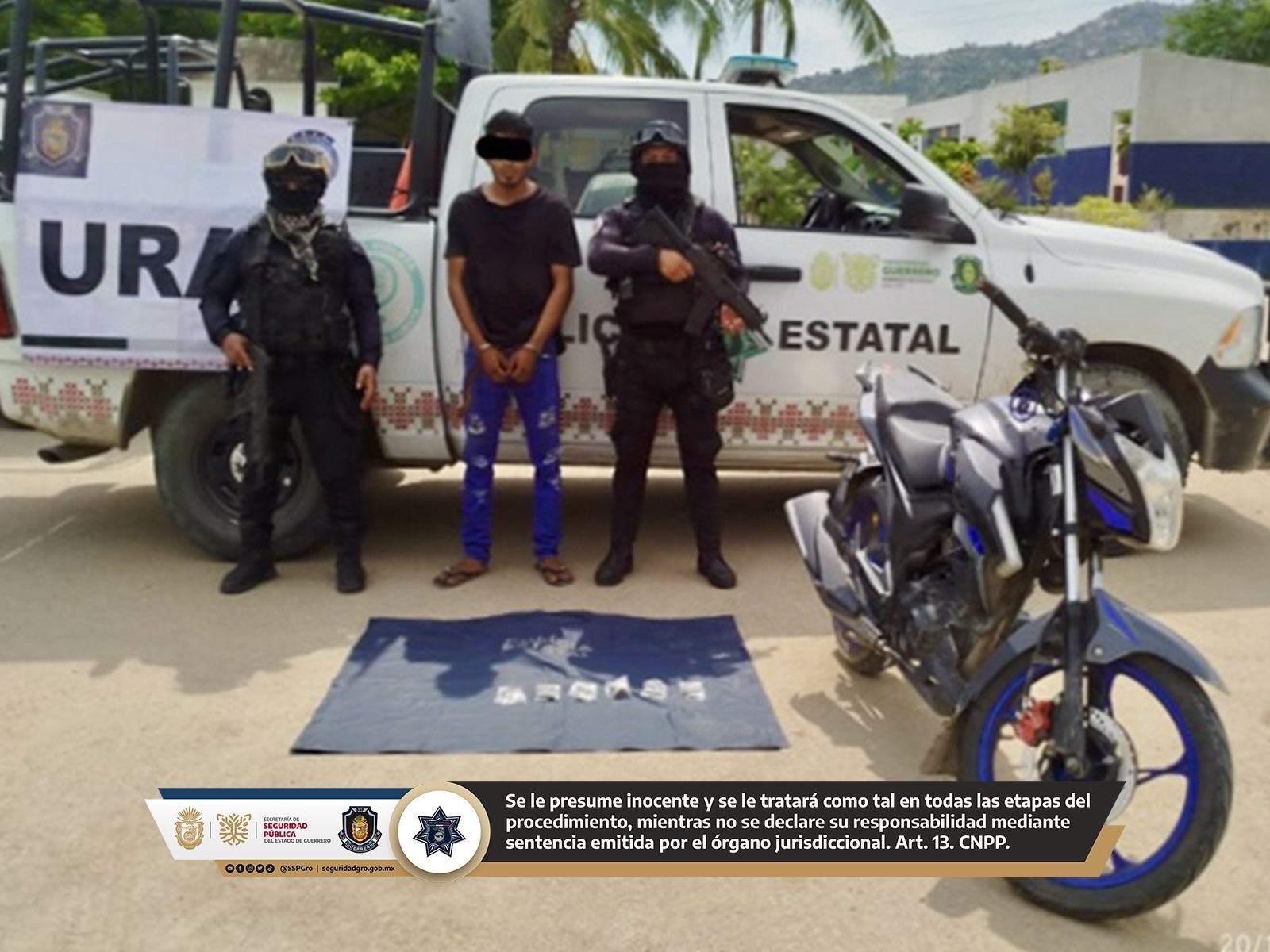 Detiene Policía Estatal a un masculino en Acapulco, se le aseguró probable droga identificada como marihuana y una motocicleta por su probable relación con hechos delictivos.