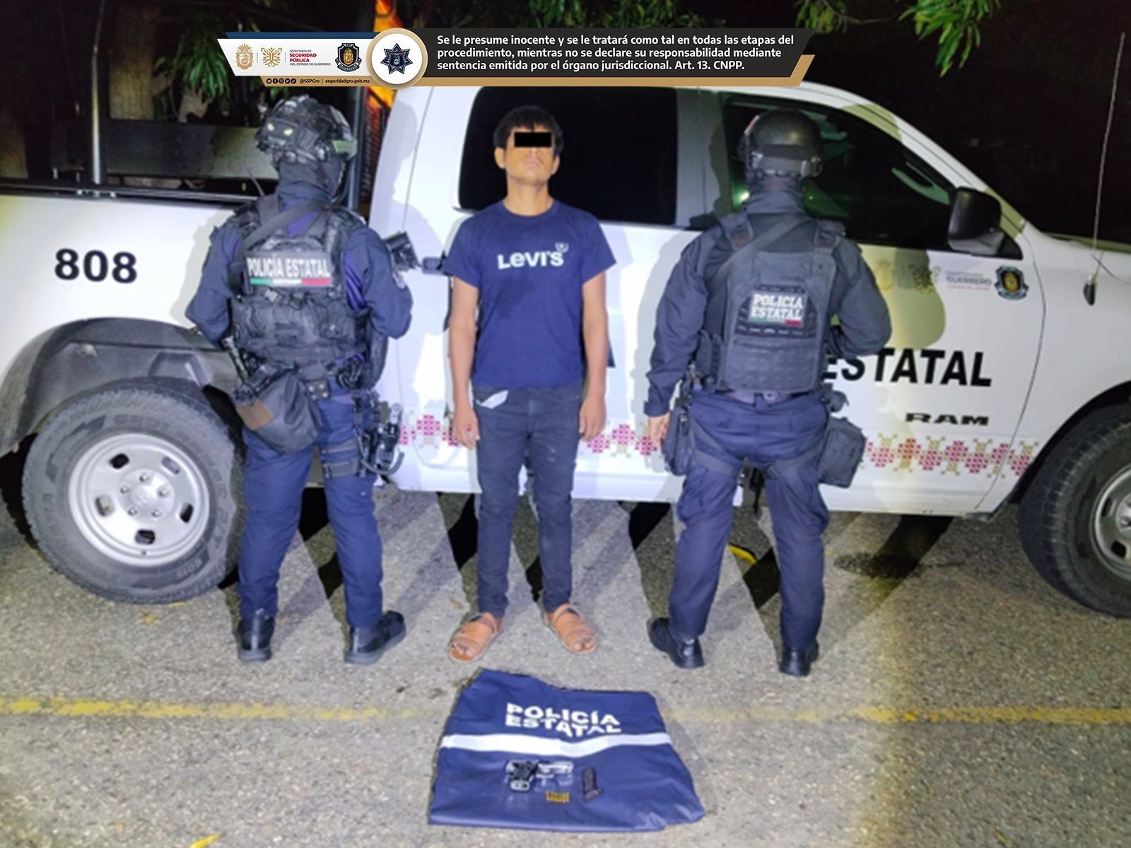 Policía Estatal detiene a un masculino con un arma de fuego corta, un cargador y seis cartuchos útiles en el municipio de Azoyú.