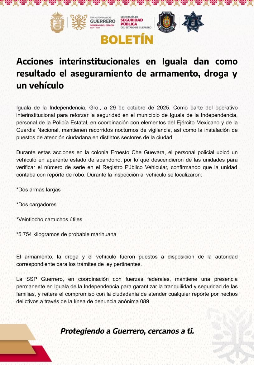 La SSP Guerrero, en coordinación con fuerzas federales, mantiene una presencia permanente en Iguala de la Independencia para garantizar la tranquilidad y seguridad de las familias, y reitera el compromiso con la ciudadanía de atender cualquier reporte por hechos delictivos a través de la línea de denuncia anónima 089.
