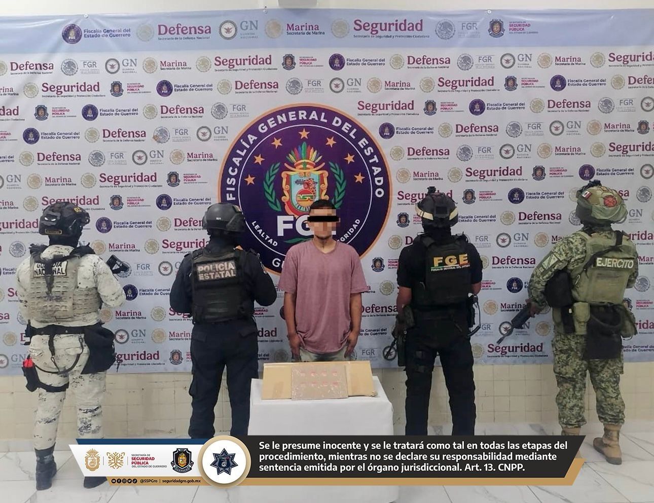 En una acción distinta, en el municipio de Chilpancingo, personal operativo realizó la detención de un masculino en la colonia Loma de Chapultepec, a quien se le localizaron envoltorios con sustancia granulada con características similares a la droga conocida como cristal.
