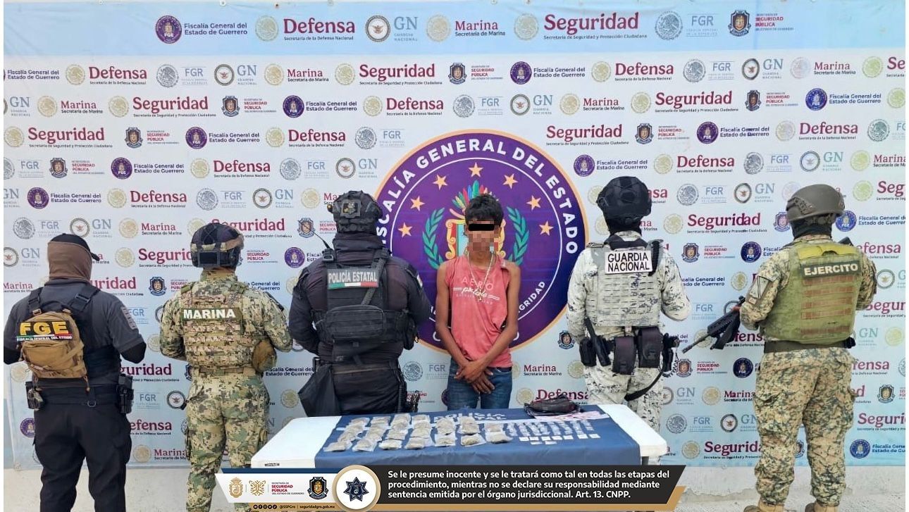 Chilpancingo, Gro., 22 de abril de 2026. La Secretaría de Seguridad Pública del Estado de Guerrero informa que, como resultado de acciones operativas interinstitucionales, elementos de la Policía Estatal, en coordinación con el Ejército Mexicano, la Secretaría de Marina, la Guardia Nacional y la Fiscalía General del Estado, realizaron una detención y el aseguramiento de presunta droga en el municipio de Acapulco.