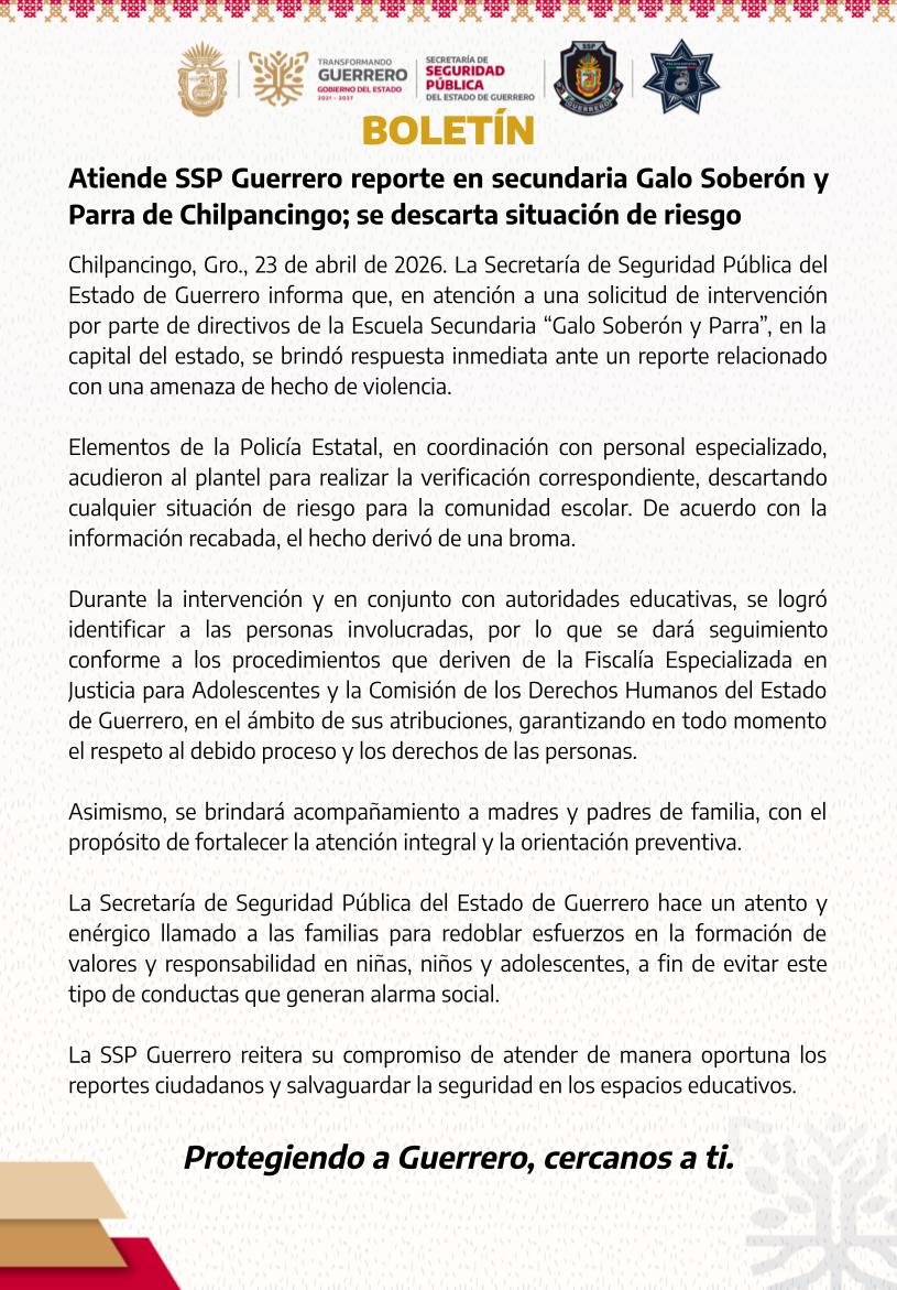 Chilpancingo, Gro., 23 de abril de 2026. La Secretaría de Seguridad Pública del Estado de Guerrero informa que, en atención a una solicitud de intervención por parte de directivos de la Escuela Secundaria “Galo Soberón y Parra”, en la capital del estado, se brindó respuesta inmediata ante un reporte relacionado con una amenaza de hecho de violencia.