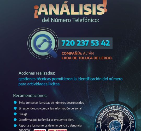 La Secretaría de Seguridad Pública del Estado identificó el número 720 237 53 42 (Compañía: ALTÁN - Lada de Toluca de Lerdo) vinculado a actividades ilícitas.