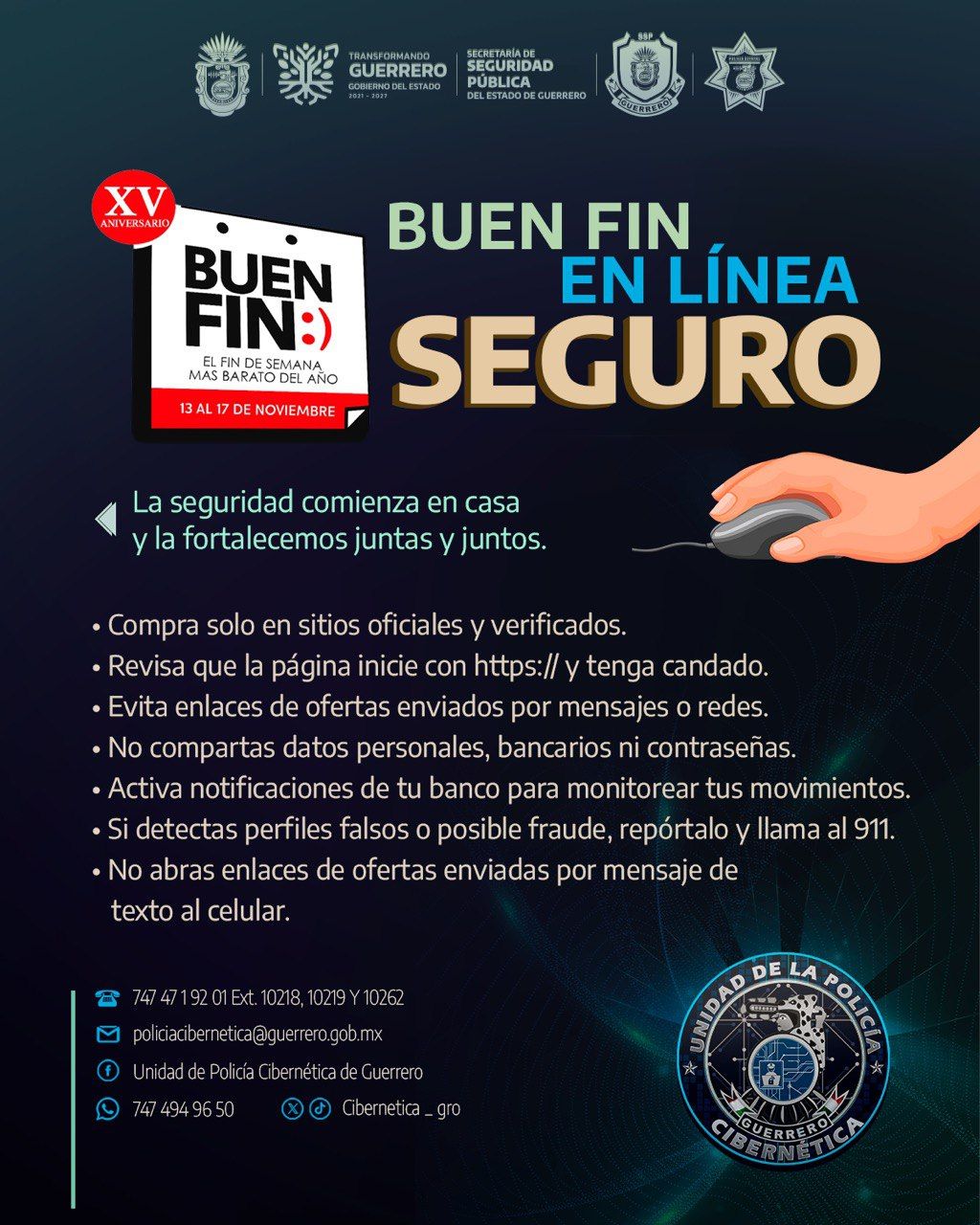 Recomendaciones Durante el Buen Fin, compra en línea de forma segura. Sigue las recomendaciones de la SSP Guerrero y evita fraudes o riesgos digitales. Cuidar tu información es cuidar tu seguridad. Protegiendo a Guerrero, cercanos a ti. 13 Noviembre 2025