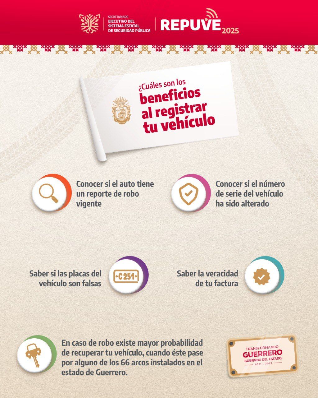 * Aumentar las probabilidades de recuperación en caso de robo, gracias a los 66 arcos de seguridad en Guerrero.